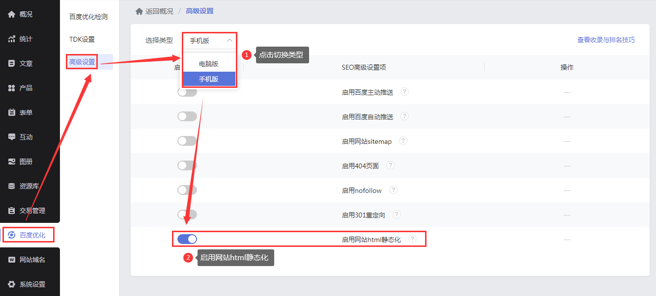 在建站管理后台点击【百度优化-高级设置】,选择要启用网站html静态化的类型,选择后点击启用按钮。