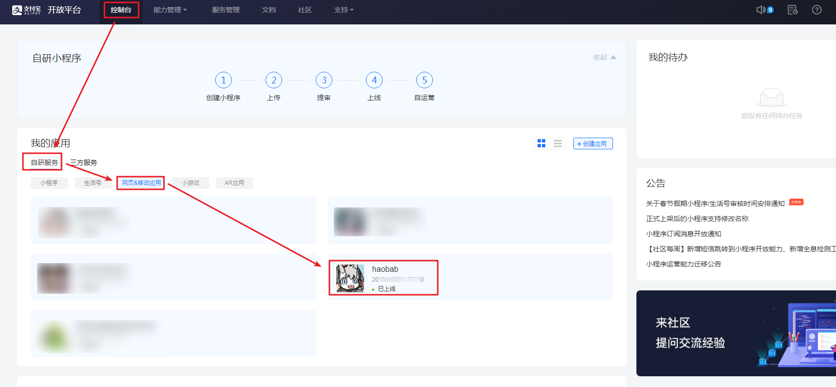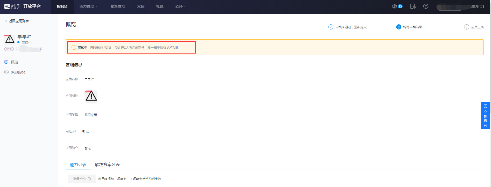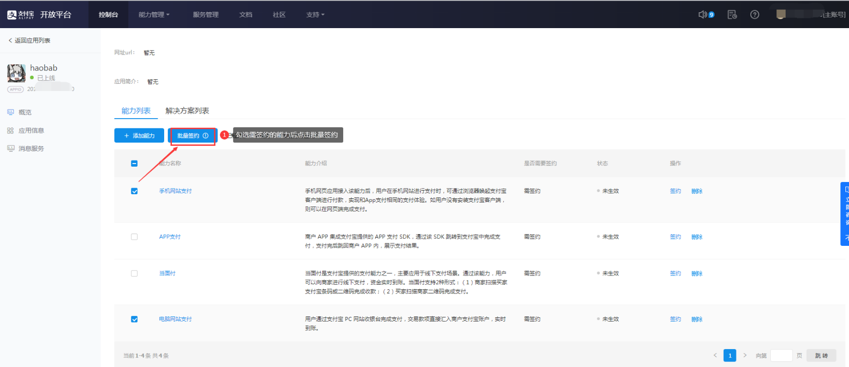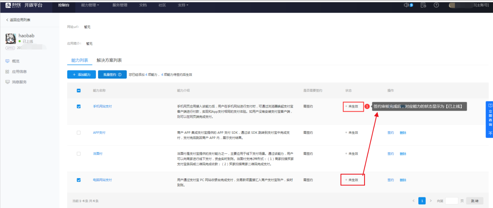 3.1 进入支付宝开放平台,点击【控制台-自研服务-网页&移动应用】找到申请的应用,显示已上线证明已经审核通过,可以添加功能并签约了。