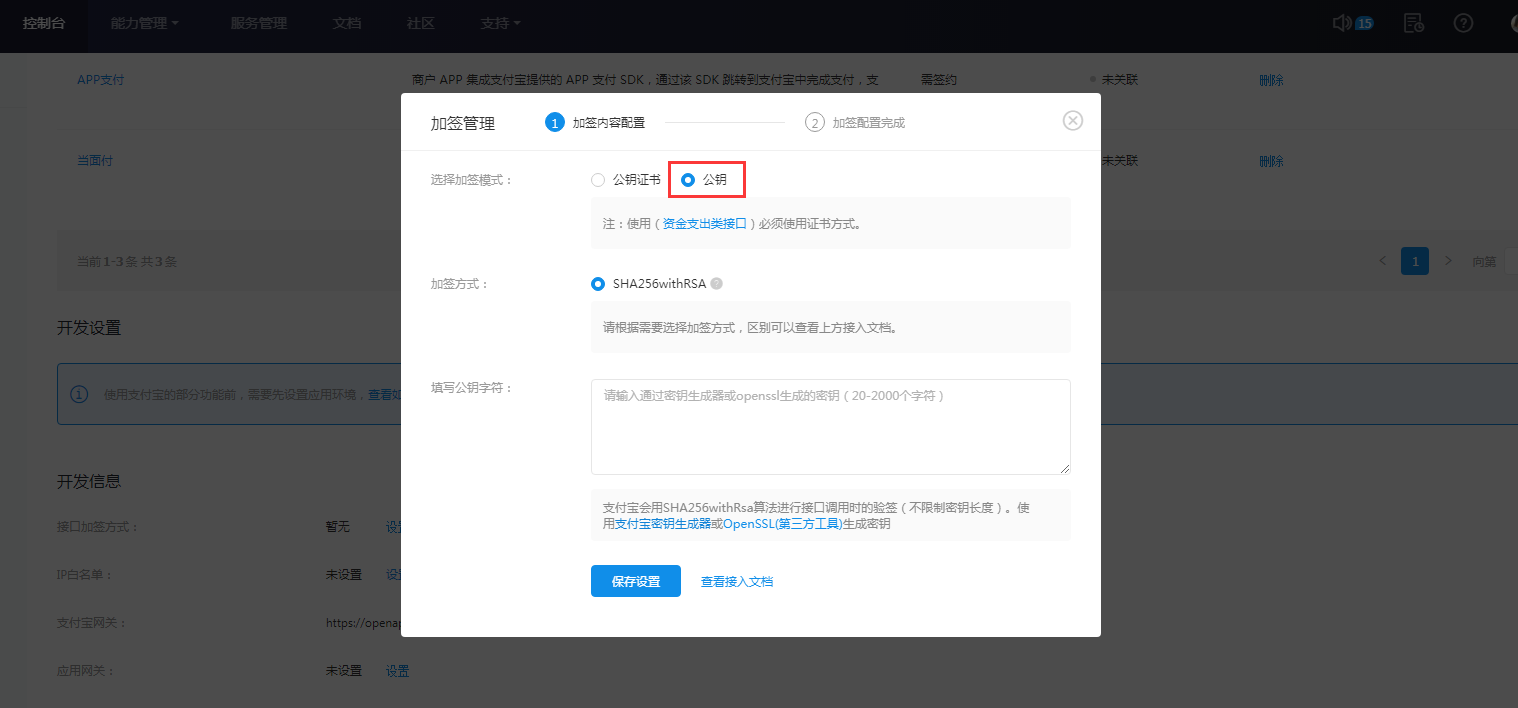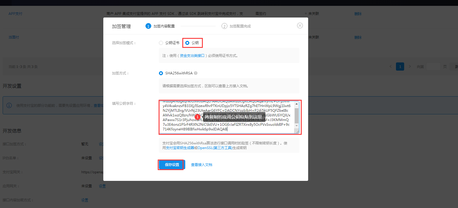 2.5 回到支付宝开放平台,将复制的应用公钥粘贴到【填写公钥字符】位置。然后点击【保存设置】。如图: