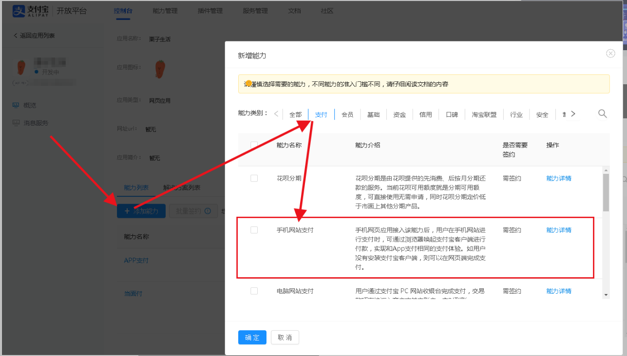 (注意:仅开通手机网站支付用户可以只添加手机网站支付的能力即可)
