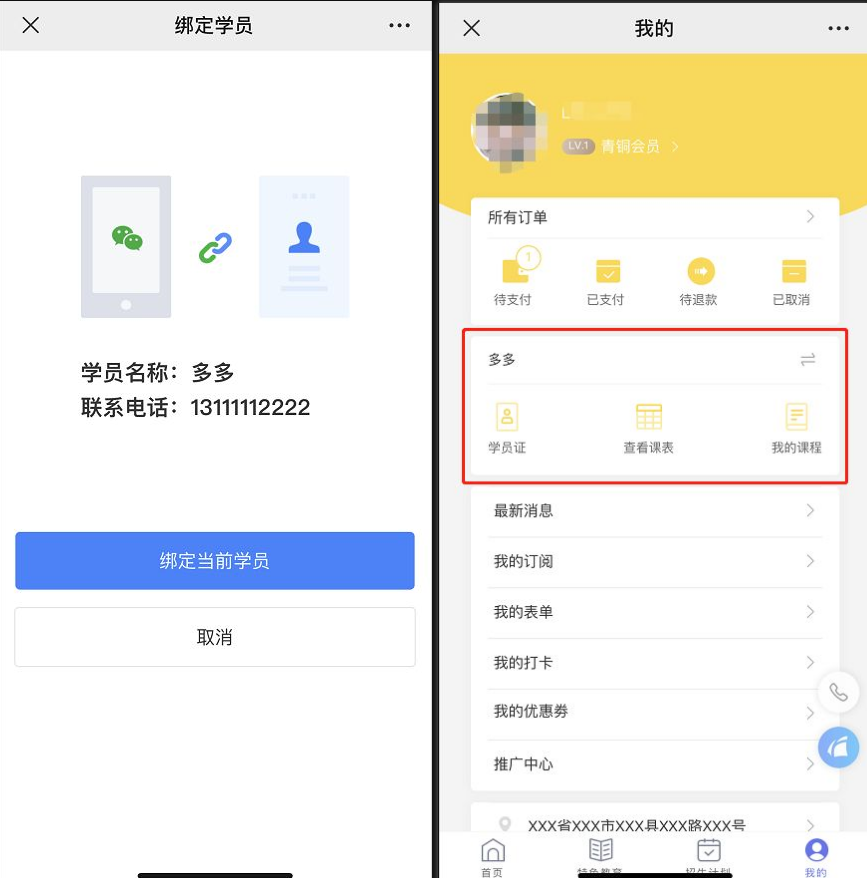 绑定微信后,客户可从微信上收到上课通知、查看课表、约课等信息。