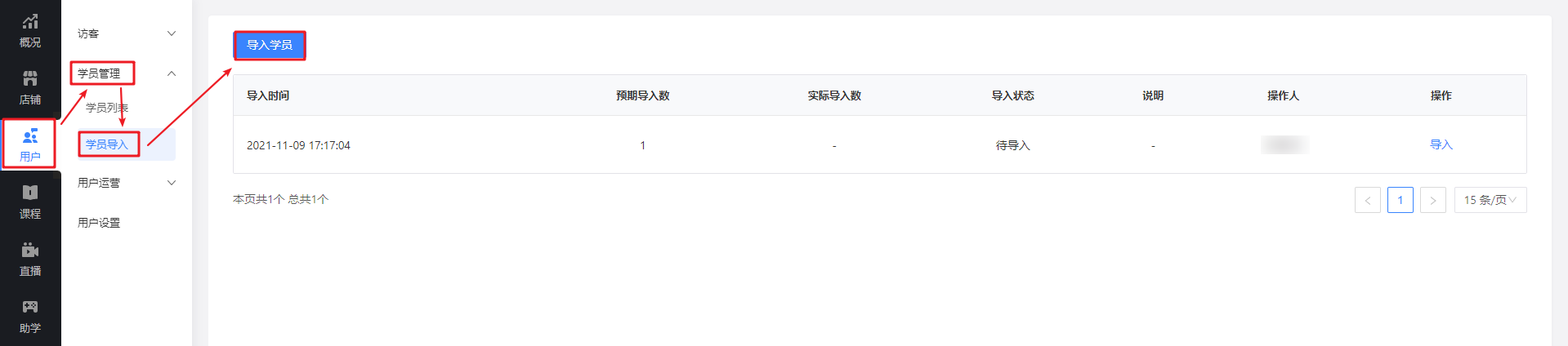 1.1 在 【管理后台-用户-学员管理-学员导入】点击【导入学员】按钮。