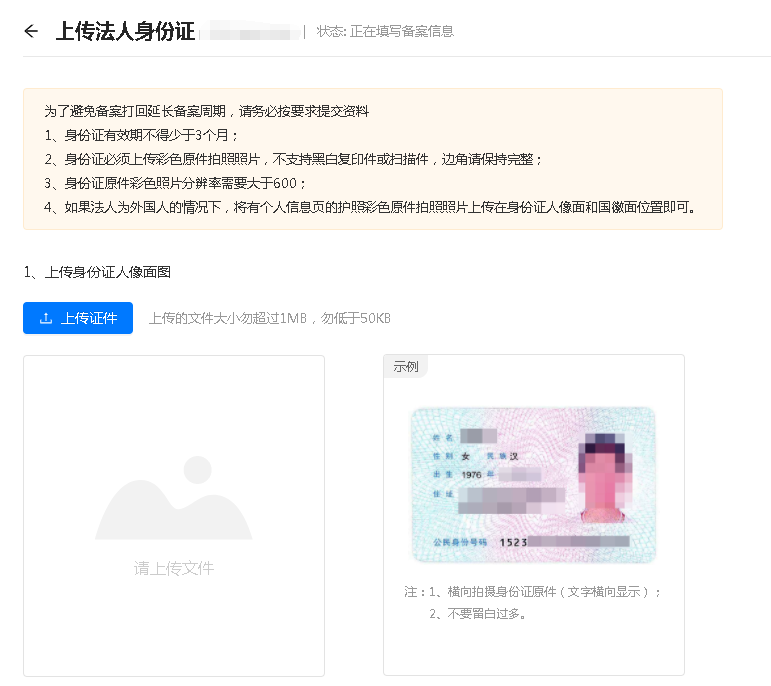 b. 因电子化备案对证件要求较严格,身份证必须上传彩色原件拍照照片,不支持黑白复印件或扫描件,边角请保持完整;