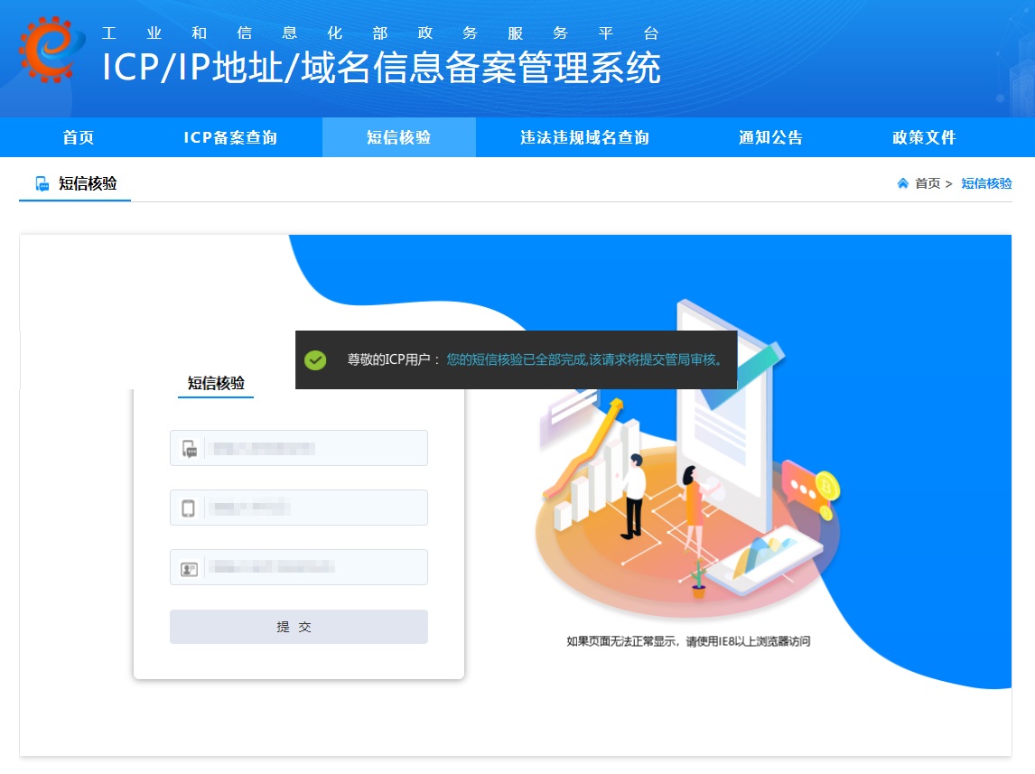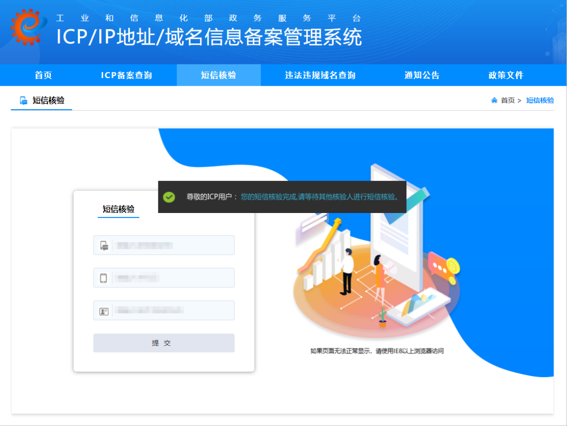 2.3 提交后,请留意页面提示短信核验结果,如系统提示【您的短信核验完成,请等待其他核验人进行短信核验】,说明您的备案中还有其他需验证的手机号码,请联系其他负责人及时完成核验,如超过24小时未核验,工信部系统将会备案进行退回。
