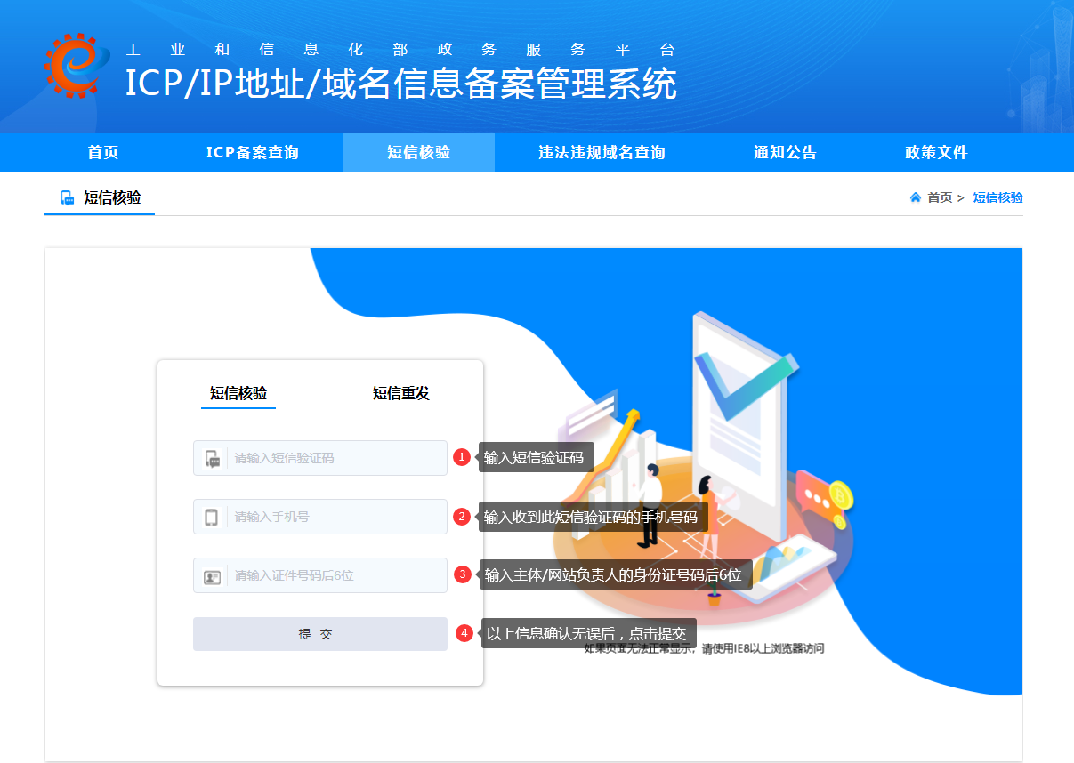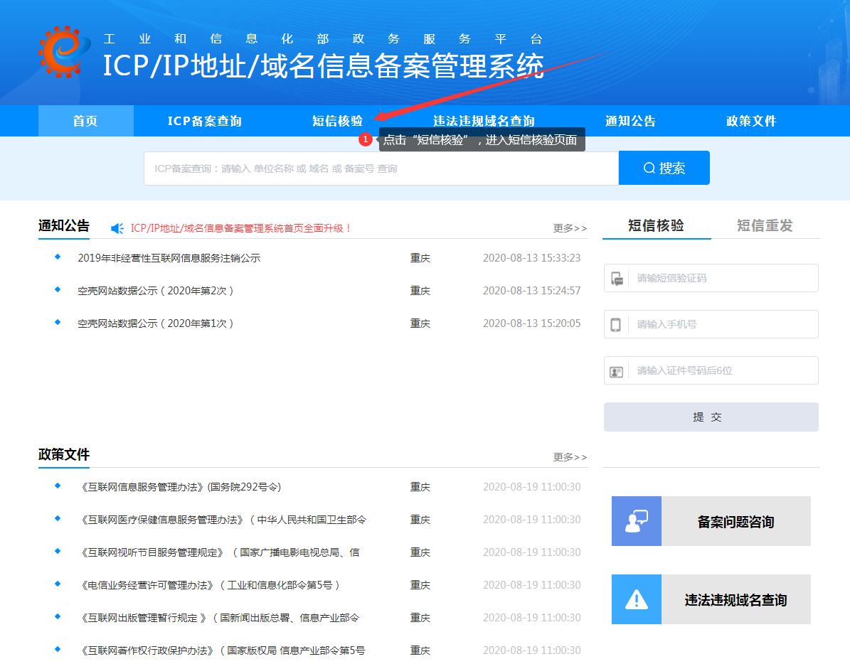 3.1 访问工信部备案管理系统(https://beian.miit.gov.cn),点击短信核验。