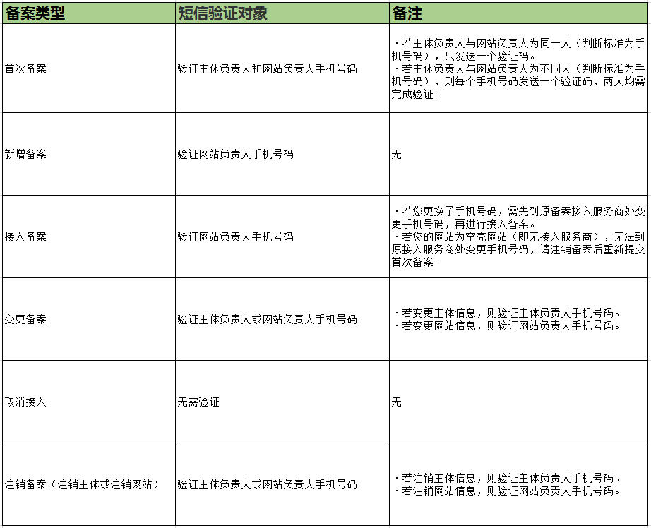 各省市进行以下类型的备案申请时需通过工信部备案管理系统(https://beian.miit.gov.cn)进行短信核验,详情如下所示: