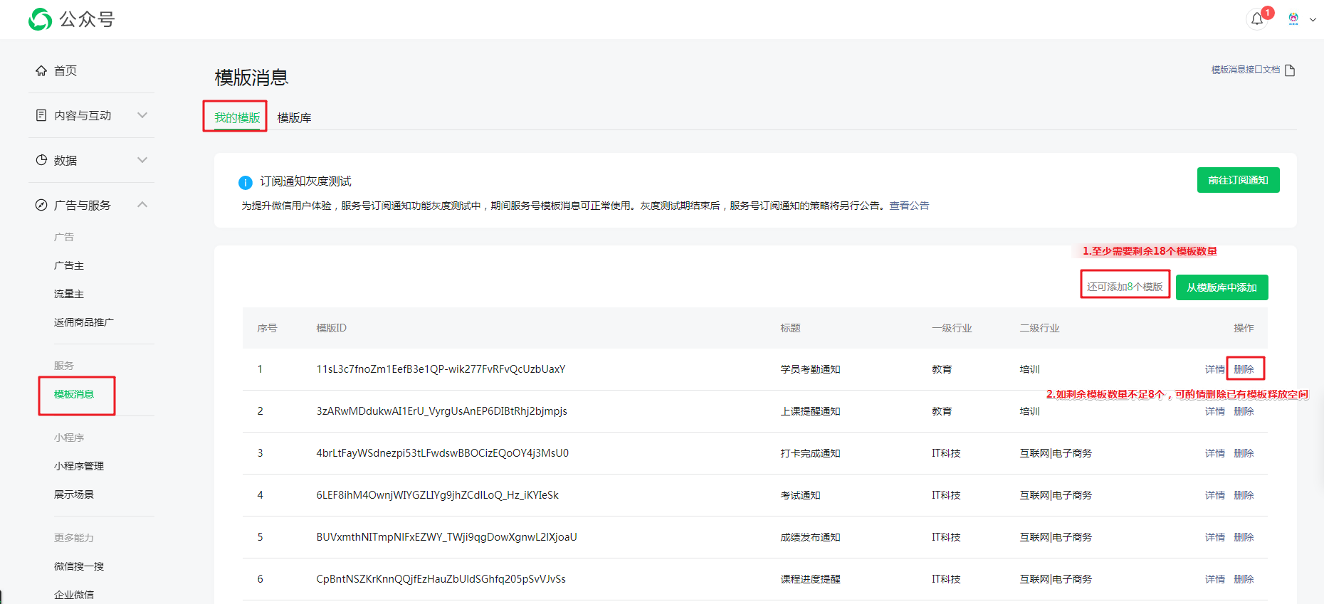 提醒:每个用户每日收到的公众号消息不宜过多,如被过多用户举报骚扰,有可能会被微信禁用公众号消息通知。