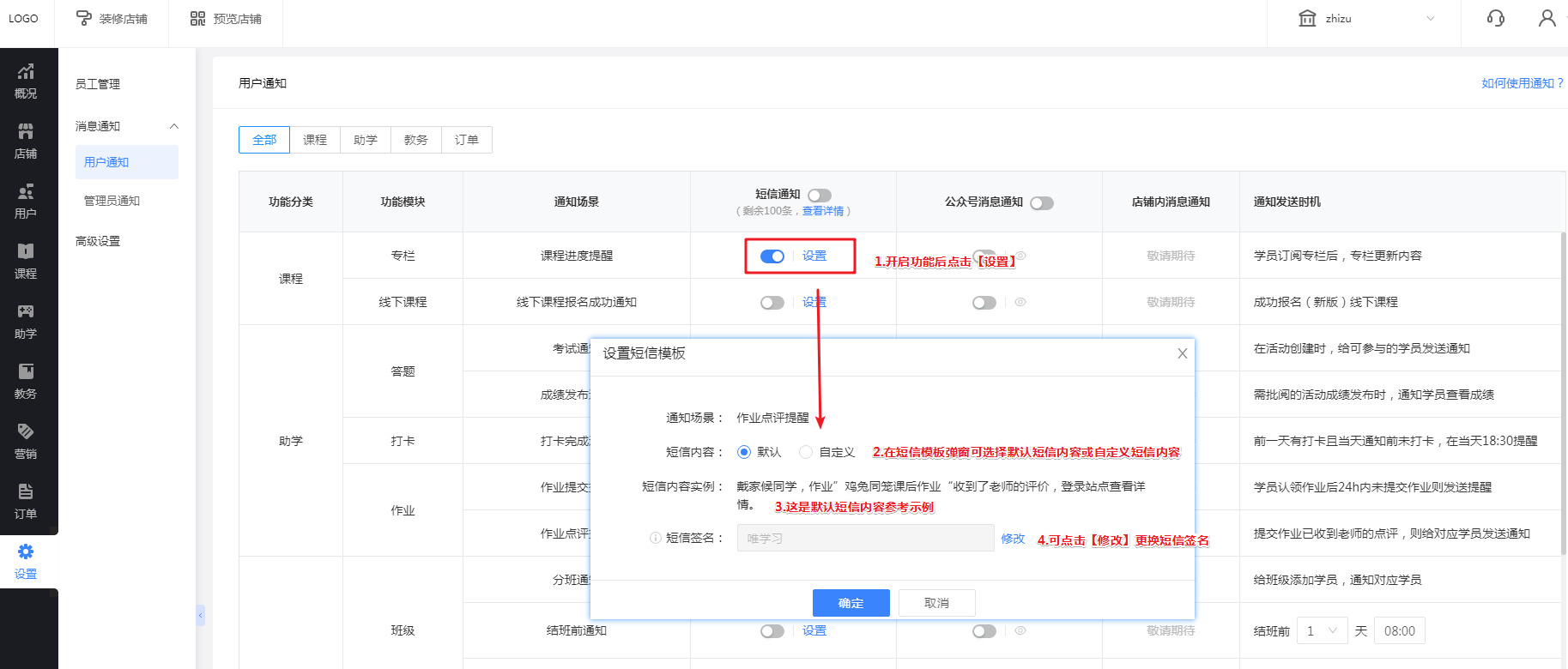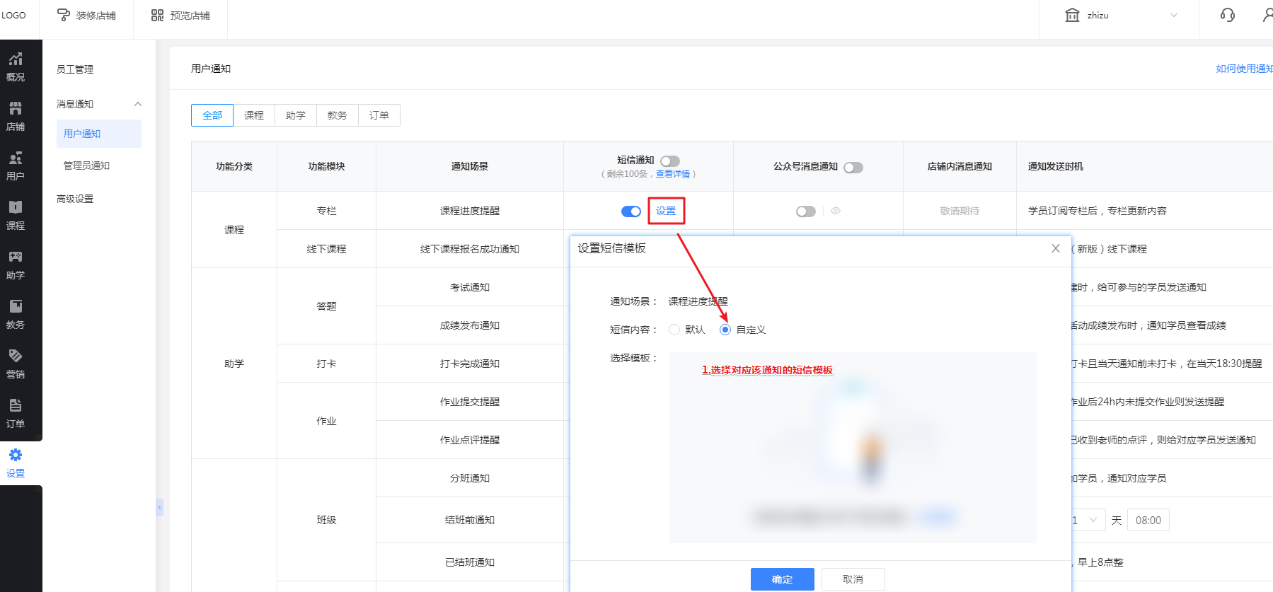 申请完成后回到教育管理后台【设置-消息通知-用户通知】,在需要短信通知的推送标题后点击【设置】,短信内容点击【自定义】后选择对应的通知短信模板。如下图: