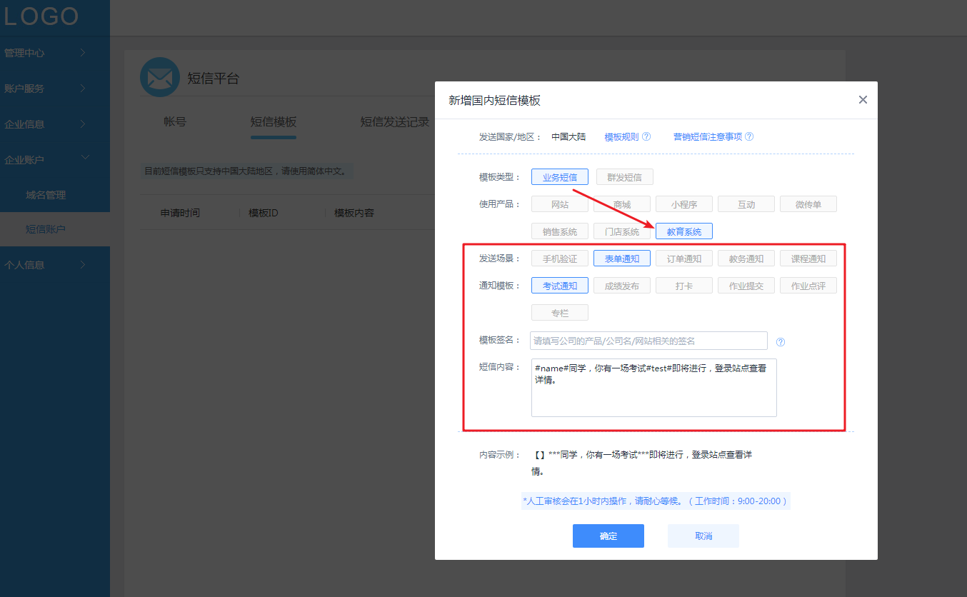(自定义短信模板建议提前24小时在短信平台进行申请审核)