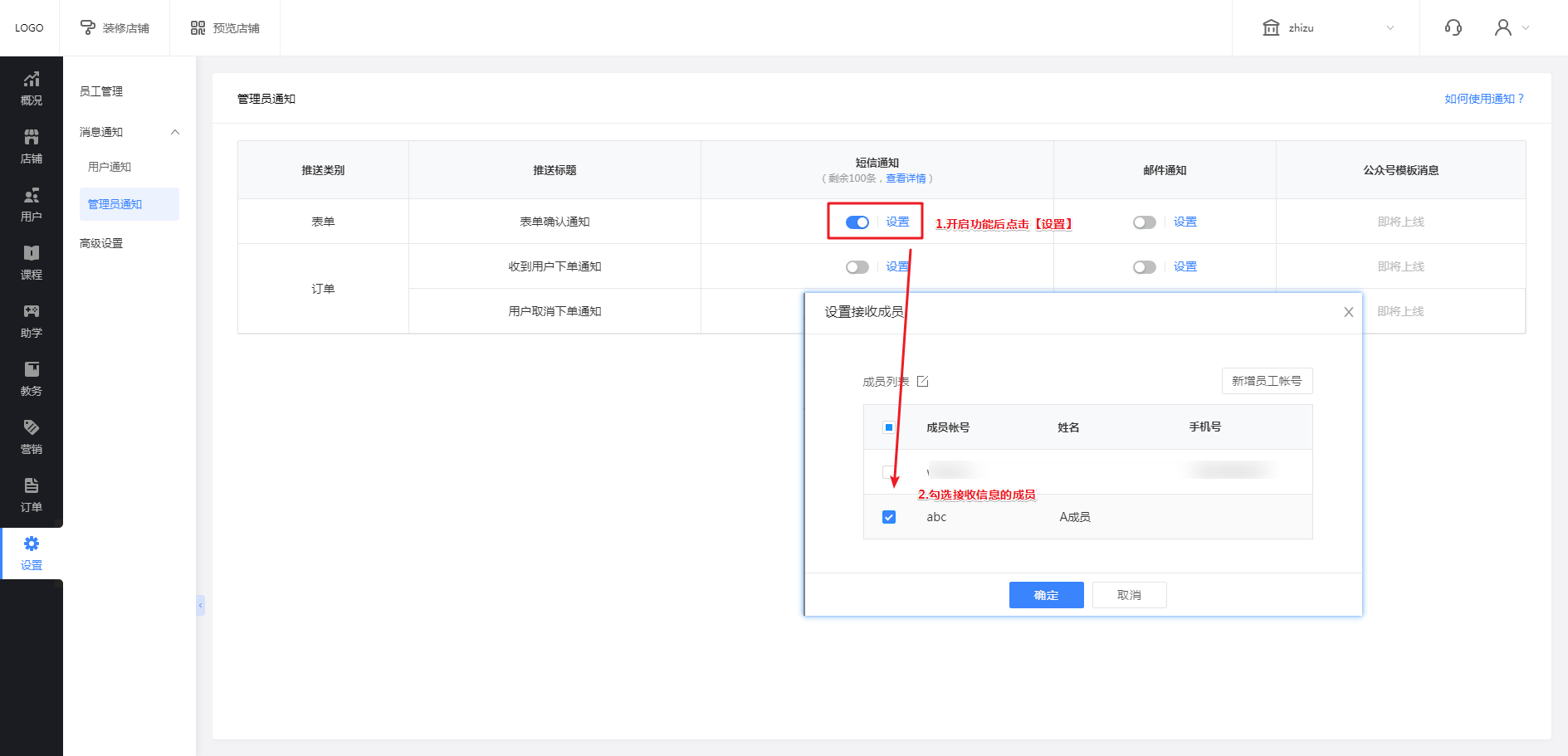 ① 在教育管理后台点击【设置-消息通知-管理员通知】,在需要消息通知的推送标题后点击开启按钮,同时需要点击【设置】进入勾选要通知的成员账号。