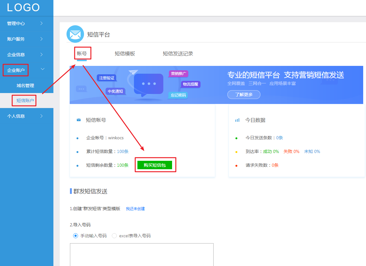 要给客户发送短信,需要先在【企业中心-企业账号-短信账号】购买短信包(充值短信)。
