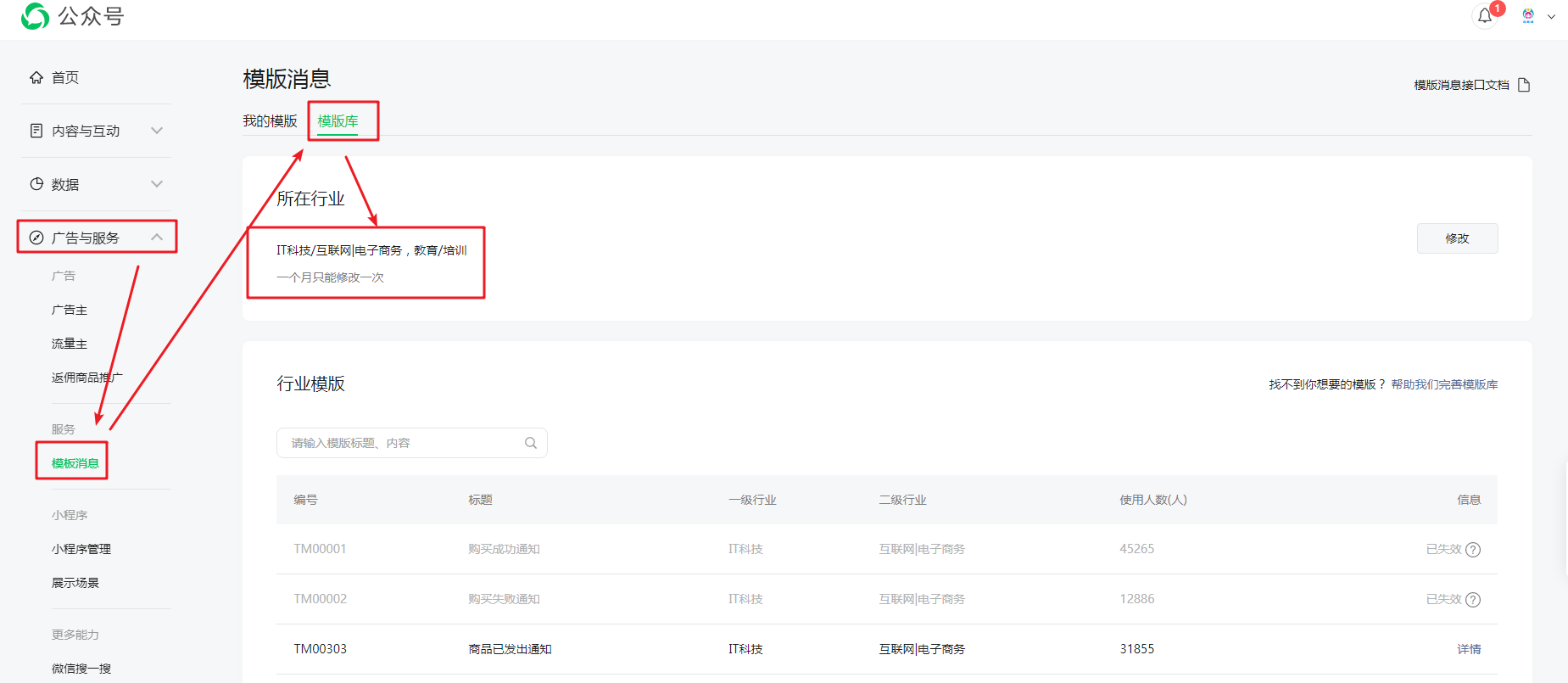需要保证您的公众号已开启【模板消息】,并且行业包括【IT科技->互联网|电子商务】。