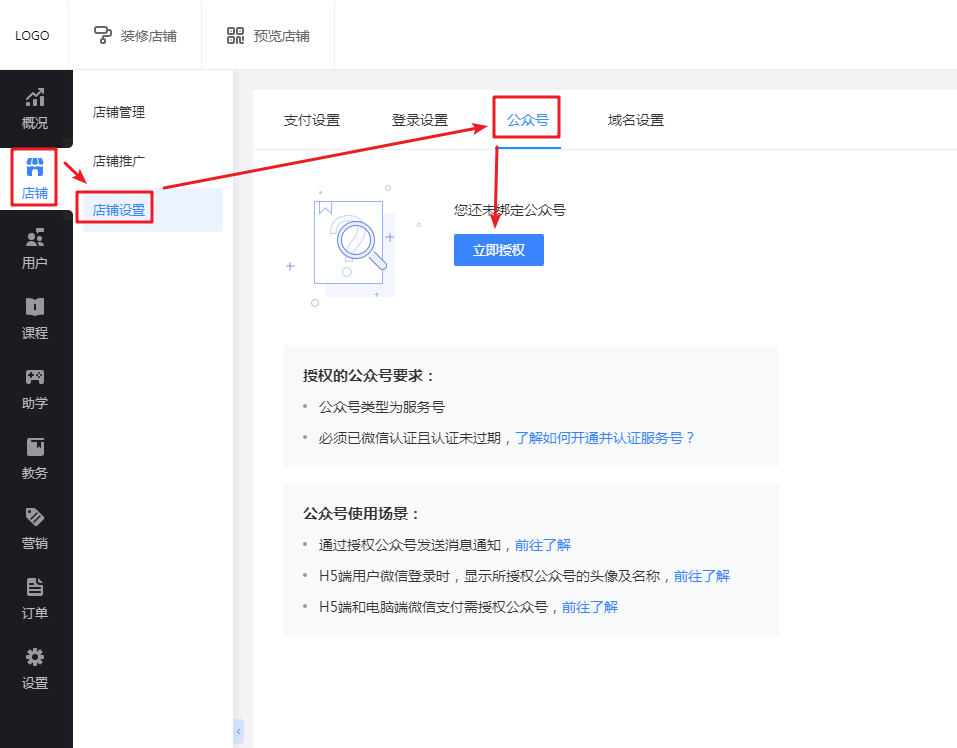 使用公众号消息功能,需要您把服务号授权给教育,请前往教育管理后台 【店铺-店铺设置-公众号】中进行授权。
