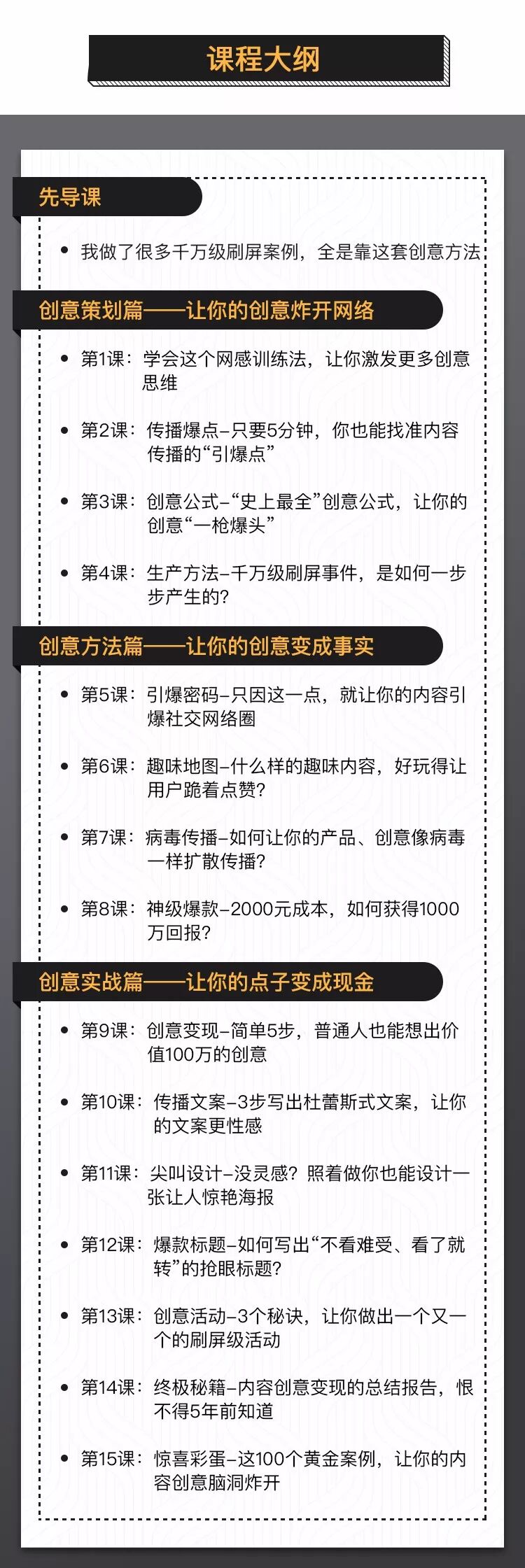 我们想用实例告诉你,不需要。创意到底靠什么呢?系统!一套完整、清晰的营销系统!当这套系统印刻在你的大脑里,当虚无缥缈的创意变得清晰时,就是你告别痛苦、拥抱阳光的时候。